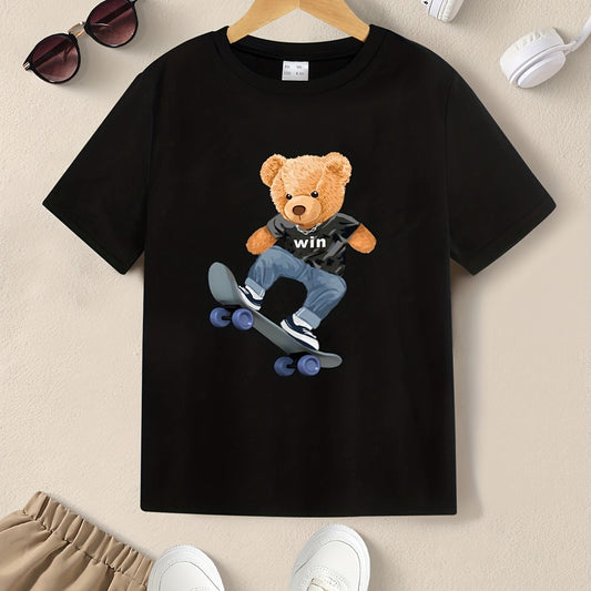 Bear Playing Skateboard Print Round Neck T-shirt Tees Tops Casual Soft Comfortable Boys And Girls Summer Clothes