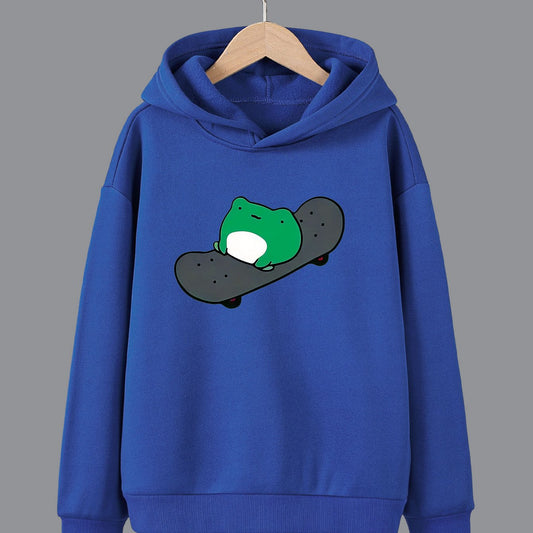 Cartoon Skateboard Frog Print Girls Hooded Sweatshirt Pullovers, Teen Kids Long Sleeve Tops For Sports Daily Leisure