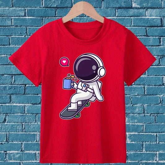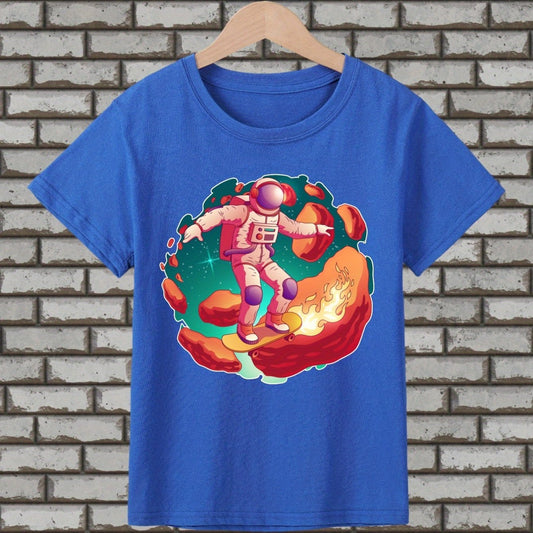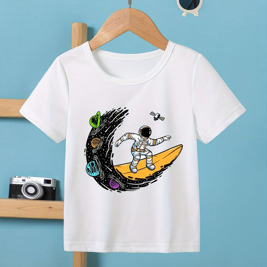 Girl's Cartoon Astronaut Playing Skateboard Pattern Shirt, Casual Breathable Comfy Short Sleeve Tee Top For City Walk Street Hanging Outdoor Activities