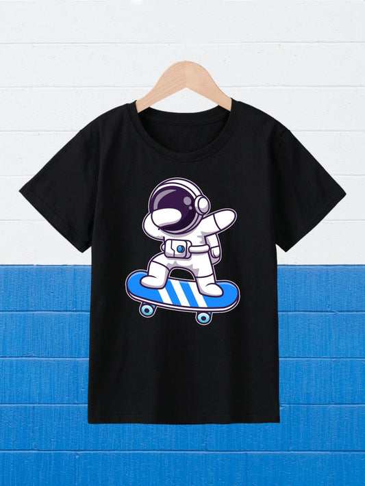Girl's Cartoon Astronaut Playing Skateboard Pattern Shirt, Casual Breathable Comfy Short Sleeve Tee Top For City Walk Street Hanging Outdoor Activities